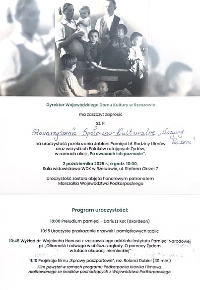 W czwartek, 2 października 2025 r., o godz. 10 w sali widowiskowej Wojewódzkiego Domu Kultury w Rzeszowie odbyła się druga edycja akcji „Po owocach ich poznacie”, której celem jest upamiętnienie bł. Rodziny Ulmów oraz wszystkich Polaków ratujących Żydów podczas II wojny światowej. W tej edycji udział wzięło także nasze Stowarzyszenie.